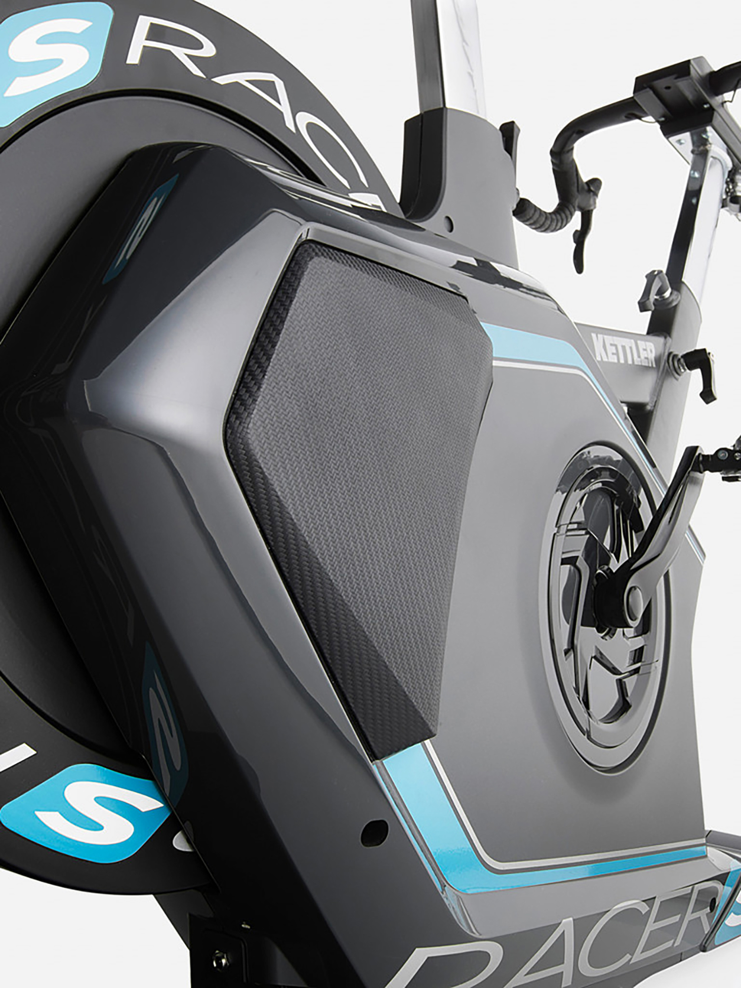Nichts kann das Trainieren auf einem Straßenrad ersetzen – aber, auch wenn der Fahrtwind fehlt, kommt dem Radfeeling nichts so nahe wie der Biketrainer Racer S von Kettler und seine zahlreichen Trainingsprogramme sorgen für ein abwechslungsreiches Cardio-Workout. Das Fahrgefühl ist einem Outdoor-Rennrad mit Kettenantrieb angepasst. Im Racer S arbeitet zwar ein Riemen, der die Kraft überträgt, aber im drehzahlabhängigen Trainingsmodus lässt das Magnetbremssystem bei jedem Gangwechsel den Widerstand kurz sprunghaft ansteigen, so als würde eine Kette von einem auf das nächste Ritzel springen. Daneben kann das Bike aber auch als Ergometer mit einem Widerstandsbereich von 25 bis 600 Watt betrieben werden. Zudem besitzt der spezielle Rennradlenker Schaltgriffe, über die sich die Gänge ohne Unterbrechung schalten lassen.